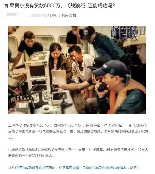 另一家公司是做网络借贷服务的,该公司的微信公号刊登了一篇《如果吴京没有贷款8000万,<战狼2>还能成功吗?》的文章,并配发了吴京的几张照片。虽然不再是瞎编虚构,只是概述了吴京为拍摄电影《战狼2》所付出的努力、抵押房产所承受的风险及电影成功后所取得的回报,但最终目的还是为公司做宣传。比如文中有:“如果你离梦想还差一步,xxx能帮你……”等宣传语和公司介绍。