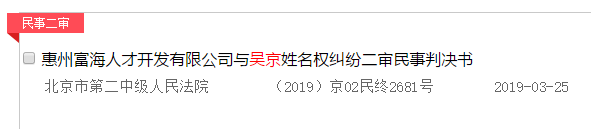 这四份民事裁判书中,惠州富海人才开发有限公司与吴京姓名权纠纷二审终判吴京胜诉。
