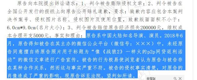 记者注意到,在《吴京与网金(北京)科技有限公司肖像权纠纷一审民事判决书》中,原告吴京认为,被告在微信号发布的文章极易使浏览者认为原告与被告存在某种合作关系。被告的侵权事实清楚,对原告的肖像造成了严重的影响。故要求将文章删并致歉、赔偿原告经济损失。